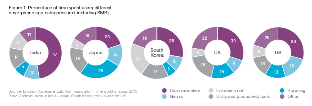 Un studiu efectuat de cei de la Ericsson ConsumerLab a relevat că utilizatorii de smartphone-uri folosesc din ce în ce mai mult aplicații de comunicare. Peste 30% din timpul petrecut pe smartphone-uri este dedicat apelurilor de voce, mesajelor, protocoalelor voice over internet (precum Skype), email-urilor și rețelelor de socializare.