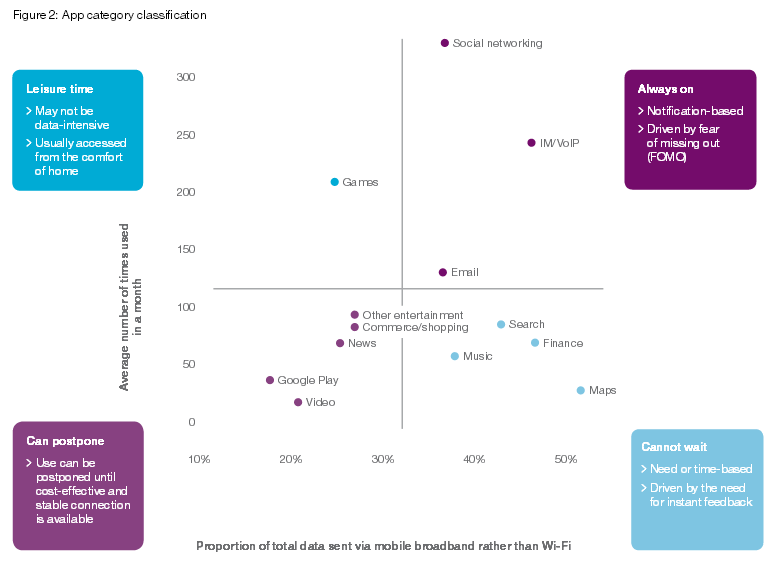 Chiar dacă smartphone-urile au o gamă largă de funcții, de la divertisment până la jocuri și fotografii, comunicarea continuă să fie activitatea dominantă. Mai mult de 30% din timpul petrecut pe smartphone-uri este dedicat apelurilor de voce, mesajelor, protocoalelor voice over internet (precum Skype), email-urilor și rețelelor de socializare. Aplicațiile de comunicare depind mai mult de lățimea benzii unei rețele, din cauza faptului că sunt mereu active.