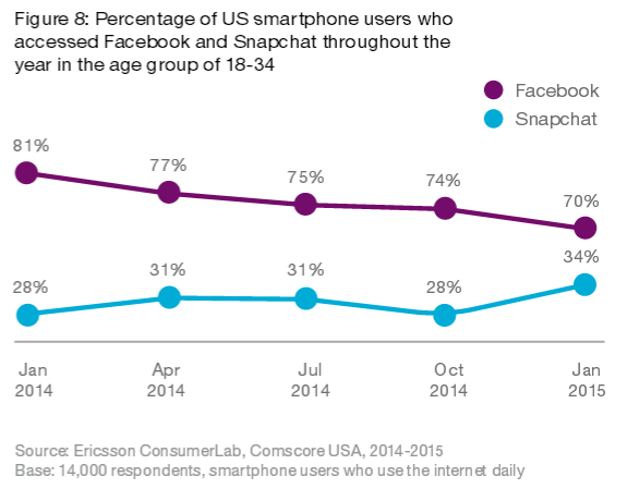 Există un interes din ce în ce mai mare și pentru aplicațiile vizuale, precum Instagram și Pinterest, ambele bucurându-se de o creștere semnificativă în ultimele 12 luni. În mod similar, popularitatea în creștere a aplicației Snapchat arată că generația tânără preferă aplicațiile vizuale cu funcționalități îmbunătățite de securitate. Acest lucru contribuie și la scăderea utilizării Facebook-ului printre utilizatorii tineri, care nu își doresc ca părinții să le vadă postările.