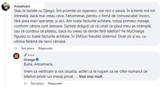 Din experiența personală, actualul furnizor de telefonie mobilă (n.a Orange) a stabilit inițial un termen de 3 zile lucrătoare pentru a fii contactat de un operator uman din departamentul Reclamații și apoi a revenit cu un alt mesaj că mai are nevoie de încă 3 zile. În trecut Vodafone a avut nevoie de mai bine de o săptămână pentru a mă contacta să mă întrebe ce problemă am. Imposibilitatea operatorului de a răspunde prin intermediul unui operator uman în timp util m-au făcut în iarnă să renunț la serviciile Vodafone. Situația reclamată celor de la Orange a fost rezolvată pe cale amiabilă după 6 zile lucrătoare. Pe de altă parte Digi are un Serviciu de Relații cu Clienții care oferă un mesaj automat în situațiile în care are înregistrate incidente de rețea în zonă dar și un termen de rezolvare. În unele cazuri excepționale, însă, poți întâmpina situații în care serviciile sunt supraaglomerate și nu poți pur și simplu să vorbești cu cineva.