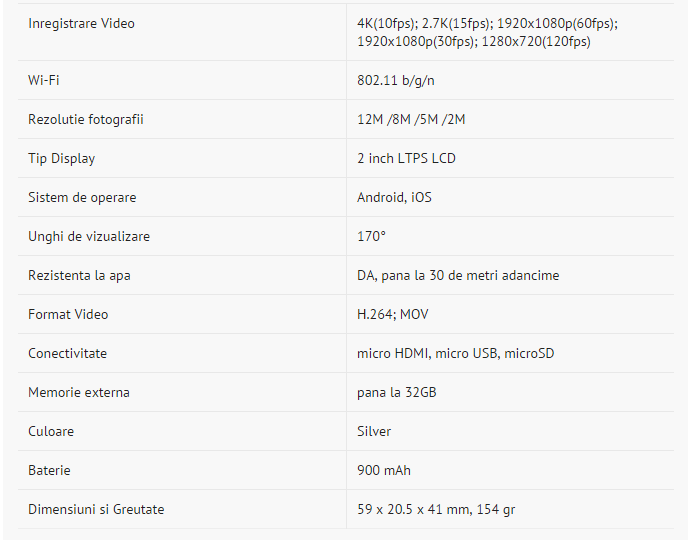 iSmart 4K este o cameră video sport ultracompactă care filmează la rezoluție 4K cu 10 frame-uri pe secundă, iar la rezoluție Full HD – 1080p cu 60 de frame-uri pe secundă. Camera poate înregistra și imagini la 120 de frame-uri pe secundă în rezoluție HD 720p.