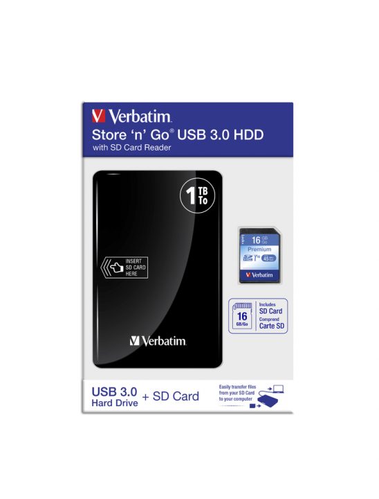 Hard disk-ul USB 3.0 Verbatim Store ‘n’ Go cu cititor de carduri SD vine la pachet cu un card de memorie SDHC Premium Verbatim de 16 GB. Acest card SD suportă formatele SDHC/SDXC şi este compatibil cu laptopuri, camere si card readere.